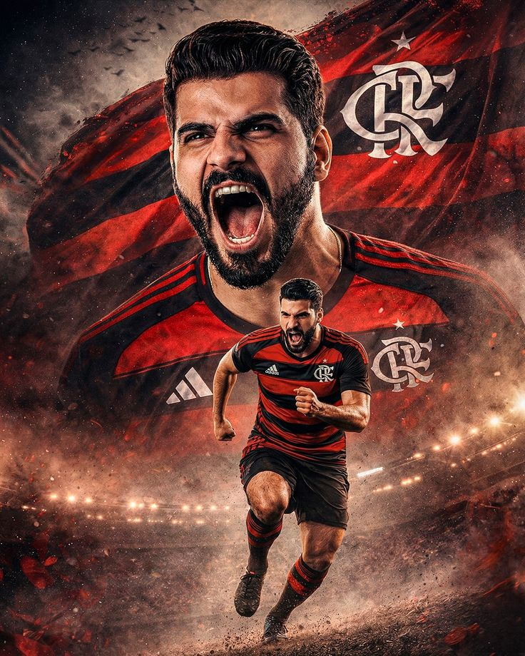 ULTRA-REALISTIC CINEMATIC FOOTBALL POSTER — OFFICIAL CLUB CAMPAIGN Aspect Ratio: 4:5 (Vertical) Style: Elite professional football key art / club marketing Create an ultra-realistic cinematic football poster featuring a professional male soccer player in a powerful dual-layer composition, designed to look like an official club campaign artwork. The visual must convey strength, rage, victory, leadership and competitive dominance, with extreme realism, dramatic stadium lighting and premium grunge textures. FACE IDENTITY — STRICT FACE REFERENCE (MANDATORY) Use the uploaded face reference image as the ONLY source for the athlete’s identity. Preserve absolute facial fidelity: Exact bone structure and facial proportions Eye shape, eyelids, iris color and spacing Eyebrow shape and density Nose width, bridge and tip Lip shape and thickness Beard and facial hair pattern (density, gaps, growth direction) Skin tone, undertone, pores, scars and natural imperfections Hairline, hairstyle direction, volume and texture No reinterpretation, no beautification, no stylization, no symmetry correction. The same exact face must appear consistently in ALL layers. COMPOSITION — VISUAL NARRATIVE LAYER 1 — HERO PORTRAIT (BACKGROUND) A massive, dominant close-up portrait of the player occupying the upper portion of the composition. Head slightly tilted back Mouth fully open in a primal scream of victory Jaw muscles, neck veins and facial tension clearly visible Emotion: rage, dominance, passion, leadership Hyper-realistic skin texture: Visible pores Sweat beads Subtle dirt and match wear Natural imperfections Hair slightly messy and damp with sweat Facial hair ultra-detailed with individual strands Strong directional cinematic lighting shaping the face with deep shadows Behind the portrait: A large, waving fabric flag Realistic fabric tension, folds and wrinkles Wind direction consistent with the scream direction Slightly torn and distressed edges for battle realism Background slightly desaturated with layered grunge textures Top background detail: Subtle silhouettes of birds flying, slightly blurred for depth and symbolism LAYER 2 — FULL BODY ACTION (FOREGROUND) A full-body version of the SAME player sprinting aggressively forward. Athletic running posture One foot lifted mid-stride, the other pushing off the ground Visible muscular tension in legs and arms Realistic motion blur ONLY on extremities Perfect identity match with hero portrait Ground interaction: Subtle dust lift beneath the cleats Small debris particles rising from impact Soft contact shadow under the feet UNIFORM — MANDATORY JERSEY REPLACEMENT Replace the uniform using the uploaded team jersey reference image. Rules: Exact team color palette from reference Accurate collar shape, sleeve cut and fit Realistic football fabric: Breathable mesh Micro-perforations Fabric stretch on shoulders and chest Sweat absorption darkening high-contact areas Matching shorts and socks Boots with realistic dirt, wear and specular highlights ❌ No readable logos ❌ No sponsors ❌ No numbers ❌ No badges ❌ No text of any kind (Only visual fabric, colors and cut accuracy) ENVIRONMENT & TEXTURES Predominantly light / neutral background Layered grunge textures Paint splashes, scratches and distressed overlays Subtle abstract geometric shards Slight diagonal energy flow across the composition Dynamic but clean, readable chaos CINEMATIC LIGHTING Strong key light from upper front Subtle rim light outlining shoulders, arms and jaw Secondary fill light preserving facial detail High contrast with balanced exposure Specular highlights on sweat and fabric folds Natural stadium lighting feel COLOR GRADING Dominant team colors based on jersey reference Slightly warm skin tones Cool shadows for contrast Professional sports broadcast grading No oversaturation Premium editorial finish CAMERA & OPTICS Hero portrait: 85mm cinematic lens look Action layer: 35mm dynamic sports lens Shallow depth of field separating subject from background Sharp focus on face and torso Foreground crystal clear Background softly diffused NEGATIVE PROMPT (MANDATORY) Text, typography, letters, numbers, logos, sponsors, badges, watermarks, UI elements, banners, extra limbs, extra faces, duplicated heads, distorted anatomy, cartoon style, illustration style, low resolution, blur on main subject, flat lighting, washed colors, noise artifacts. FINAL OUTPUT Ultra-realistic 8K quality Hyper-sharp Premium football poster Official club-level campaign artwork Ready for social media, stadium screens and marketing use NÃO ESQUEÇA DE COLOCAR O ESCUDO DO FLAMENGO NA BANDEIRA E NA CAMISA