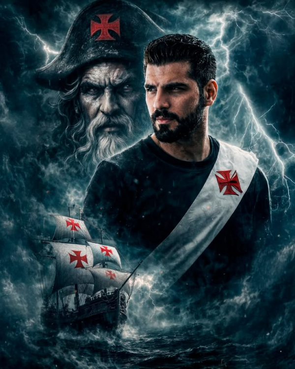 Create an ultra-realistic cinematic football poster representing Vasco da Gama, inspired by Brazilian heritage and maritime conquest mythology. The composition must follow a high-end sports collage structure with layered narrative depth, completely without any text, numbers, logos, or readable typography. Primary Subject (Foreground Player): A hyper-realistic Brazilian football player wearing the official Vasco da Gama home kit. The jersey must be black with the iconic white diagonal sash crossing from the right shoulder to the left waist, and the red Cross of Malta on the chest. Fabric texture must be visible, with realistic stitching, subtle sweat absorption, and match lighting reflections. No sponsor names, no letters, no numbers, no typography of any kind. The player is positioned slightly turned (3/4 pose), looking intensely toward the side horizon, jaw firm, focused expression. Athletic posture, chest slightly forward, shoulders tense. Subtle sweat on forehead and neck reflecting cold stadium lightning. Facial anatomy must be preserved with absolute realism: correct bone structure, natural asymmetry, visible pores, beard strand definition, micro skin texture, subtle imperfections, no plastic skin, no artificial blur, no smoothing filters. Secondary Background Layer (Mythological Narrative): Behind the player, emerging from storm mist, a massive hyper-detailed old bearded Vasco da Gama figure inspired by Portuguese navigators. The pirate must look ancient, wise, intimidating, with deep wrinkles, textured weathered skin, thick gray beard flowing in the wind. He must wear a realistic 15th-century pirate-style captain hat, dark leather texture, slightly aged and weather-beaten. On the front of the hat, placed prominently and carved or embroidered in subtle relief, the Vasco da Gama red Cross of Malta symbol must appear — integrated naturally into the fabric, not glowing artificially, not cartoonish, but realistic and historically textured. One eye slightly shadowed for dramatic intensity. The pirate must be ultra-realistic, cinematic, carved-from-stone presence, almost like a ghostly guardian of Vasco's history. No fantasy exaggeration. No caricature. No comic style. Tertiary Layer (Historical Vessel): At the lower background, partially covered by volumetric fog and storm atmosphere, a hyper-realistic 15th century Portuguese carrack ship sailing through rough ocean waves. The ship sails must carry the red Cross of Malta symbol in a realistic painted or stitched manner. The ocean should look dramatic, dark, cinematic, with splashes and mist interacting with lightning light. Environment & Atmosphere: Stormy night sky. Heavy dark clouds. Multiple cinematic lightning bolts illuminating the composition from behind. Cold blue backlight rim lighting around the player silhouette. Deep grayscale tones with selective red accents only on the Cross of Malta. Volumetric fog between layers for depth. Subtle floating rain droplets and particles. Lighting Design: Strong backlight (rim light) separating player from background. Cold blue lightning flashes as secondary key light. Soft controlled frontal shadow for dramatic chiaroscuro. High dynamic range contrast. Subtle teal tones in shadows. Red highlights slightly glowing around the Cross of Malta. Color Grading: Dominant palette: dark navy, graphite black, cold gray. Accent color: deep blood red. Cinematic teal shadows. Desaturated environment to make red symbol stand out. High contrast. 8K resolution. Unreal Engine 5 render style. Hyper-realistic detail. Official broadcast quality. Texture & Micro Detail: High pass feel. Micro-contrast skin texture. Ultra-defined beard hair. Rain interacting with skin curvature. Ocean spray particles in foreground. Subtle film grain for realism. Atmosphere: Epic. Historical. Mythological. Brazilian football identity. Legacy and conquest energy. Intimidating but noble. No text. No numbers. No typography. No blurry faces. No cartoon style. No artificial CGI look. Professional Camera Raw–Style Adjustment (High-End Retouch) Apply a subtle, professional Camera Raw–inspired correction, respecting natural skin behavior: Texture: +15 Clarity: +20 Detail Refinement: balanced. Final result: a highly realistic, professionally restored portrait with maximum fidelity, cinematic clarity, and true-to-life detail, suitable for premium editorial or commercial use.