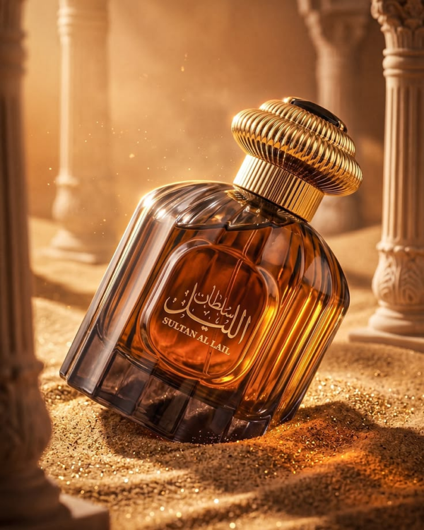 A hyper-cinematic luxury fragrance campaign built around a refined tilted-angle composition, where the perfume bottle is positioned diagonally, partially resting over soft golden sand textures, creating a dynamic and visually striking perspective that breaks traditional symmetry while elevating perceived sophistication, designed in a premium Middle Eastern-inspired environment with strong editorial and commercial appeal, the product must dominate the foreground with a close-up framing that highlights the glass reflections, amber liquid richness, and metallic detailing, captured from a slightly top-down angled perspective to emphasize depth and surface interaction, while maintaining a natural flow of the composition, the surrounding scene is crafted with elegant architectural elements such as classical columns subtly emerging from the sand, some blurred in the foreground and others softly visible in the background, creating a sense of depth and luxury heritage, combined with fine golden particles scattered across the sand surface reflecting warm highlights and adding texture richness, the lighting is intensely cinematic with a strong warm directional key light casting across the sand, producing long soft shadows and glowing reflections inside the bottle, enhanced by a precise rim light that contours the edges of the product and separates it from the background, while soft bounce light gently reveals the embossed details without flattening contrast, the atmosphere is warm, rich, and immersive with subtle heat distortion and a refined golden haze that blends seamlessly into the background, no heavy smoke, only delicate ambient diffusion to maintain elegance, the depth of field is highly controlled with foreground columns slightly blurred to create a framing effect and background elements softly diffused, ensuring the bottle remains the sharpest and most visually dominant element in the scene, the composition must include intelligent breathing space in the upper diagonal flow of the image, allowing designers to place headlines or branding without disrupting the visual hierarchy, while the lower region maintains a soft gradient in the sand for potential CTA placement, making it highly functional for social media ads, premium feed posts, and high-conversion campaigns, the Photoshop finishing must strictly follow PSD FLYER BR DNA including cinematic rim light, glow accents on golden highlights, warm orange tonal grading, floating particles subtly illuminated, halftone texture for depth richness, fine grain overlay for realism, ultra-clean premium cutout effect, strong vignette guiding focus toward the product, enhanced contrast between highlights and shadows, advanced depth blur between visual layers, subtle foreground blur for immersion, light leaks delicately entering from the edges to enhance cinematic feel, and refined shadow integration grounding the product naturally into the sand surface, resulting in a visually powerful, elegant, and high-conversion luxury fragrance advertisement ready for professional use across feed, stories, and premium marketing campaigns.