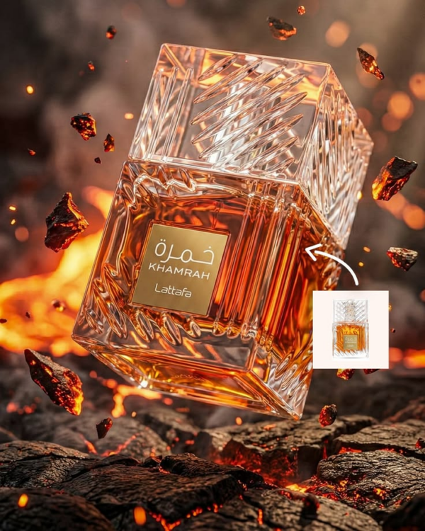 The perfume bottle from the reference image must be faithfully preserved with absolute accuracy — identical bottle shape, glass thickness, amber liquid color, transparency, internal refraction, label design, typography, logo placement, proportions, cap material, reflections, and material finish. Do not alter, redesign, rename, stylize, replace, remove, or add any text, logos, symbols, or branding elements beyond what already exists on the original bottle.