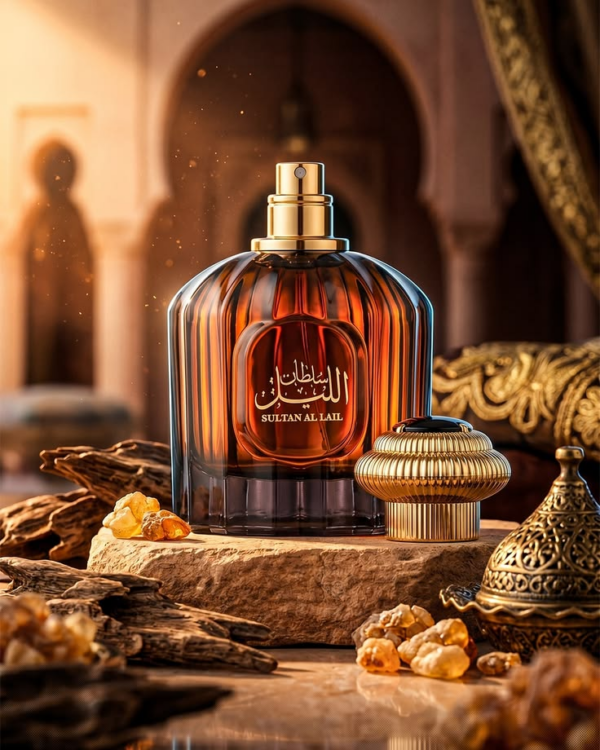 A luxurious, high-end commercial product scene featuring an oriental niche fragrance bottle as the dominant central subject, designed with a cinematic and premium advertising approach inspired by elite perfume campaigns, set in a warm Arabian luxury atmosphere that conveys exclusivity, sensuality, and depth, with the perfume bottle positioned perfectly centered on a textured stone pedestal to elevate its importance and create a hero composition, captured from a slightly low angle to enhance power and prestige, surrounded by carefully arranged elements such as raw oud wood pieces, golden resin crystals, and intricate metallic accessories that reinforce the Middle Eastern identity and richness of the product, all composed with strategic balance to guide the viewer’s eye directly to the bottle while maintaining a visually immersive environment, the lighting is deeply cinematic with a strong warm key light coming from the side to create rich amber reflections inside the glass, combined with a subtle rim light outlining the bottle edges to separate it from the background and enhance its silhouette, complemented by soft bounce lighting to reveal texture details without flattening contrast, the depth of field is intentionally shallow with foreground elements slightly blurred to create a layered composition, adding realism and dimensionality, while the background features a soft architectural desert-inspired setting with elegant arches and warm tones, subtly blurred to maintain focus on the product, the entire environment should feel rich, tactile, and atmospheric, with golden highlights reflecting across surfaces and materials, enhancing the perception of luxury and warmth, the composition must include intelligent negative space around the product to allow future placement of branding, headline, or CTA if needed, without compromising visual harmony, maintaining strong commercial usability for social media ads, premium feeds, or high-conversion campaigns, the Photoshop finishing must include cinematic rim light, glow accents on highlights, warm orange reflections, floating particles subtly illuminated in the air, halftone texture for depth, fine grain overlay for realism, premium cutout sharpness on the bottle edges, vignette to focus attention, strong contrast balancing shadows and highlights, depth blur for separation between layers, soft foreground objects slightly out of focus for immersion, subtle light leaks for cinematic richness, and delicate reflections on the surface beneath the product to ground it naturally, ensuring the final visual feels like a luxury fragrance advertisement ready for high-end branding, with a clean and professional layout that respects safe margins for feed applications and maintains strong visual breathing space for designers to adapt, refine, and convert into high-performance social media creatives.