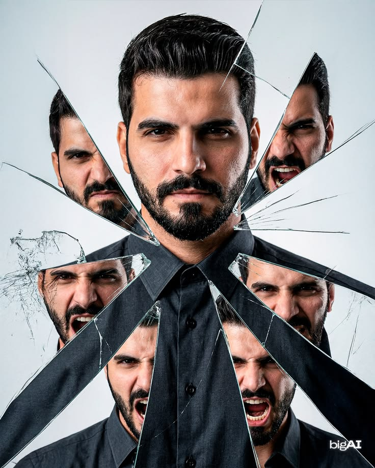 Signature shattered-glass concept: place a cracked mirror/glass layer in the foreground, with multiple large shards and fine fracture lines radiating across the frame. The glass shards must create triangular and diagonal cuts across the face and torso. In several key shards, show alternate reflected versions of the same subject’s face with different emotional expressions (anger, screaming, intense grimace), while the main central face remains calm and stern. The shard reflections should feel like true reflections—proper perspective, alignment, and realistic distortion consistent with angled glass.