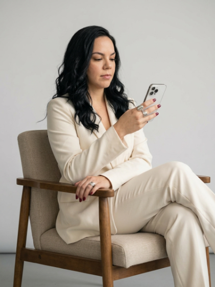 Relaxed elegant pose: body slightly leaned back and angled, legs softly crossed, one arm holding a smartphone near face level, other arm resting naturally on the chair.