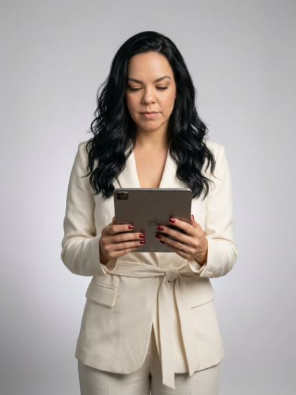 Accessories include subtle rings and neatly manicured nails painted in deep red, adding contrast and detail. The tablet must appear modern and realistic, with accurate proportions, material reflections, and fine detailing.
